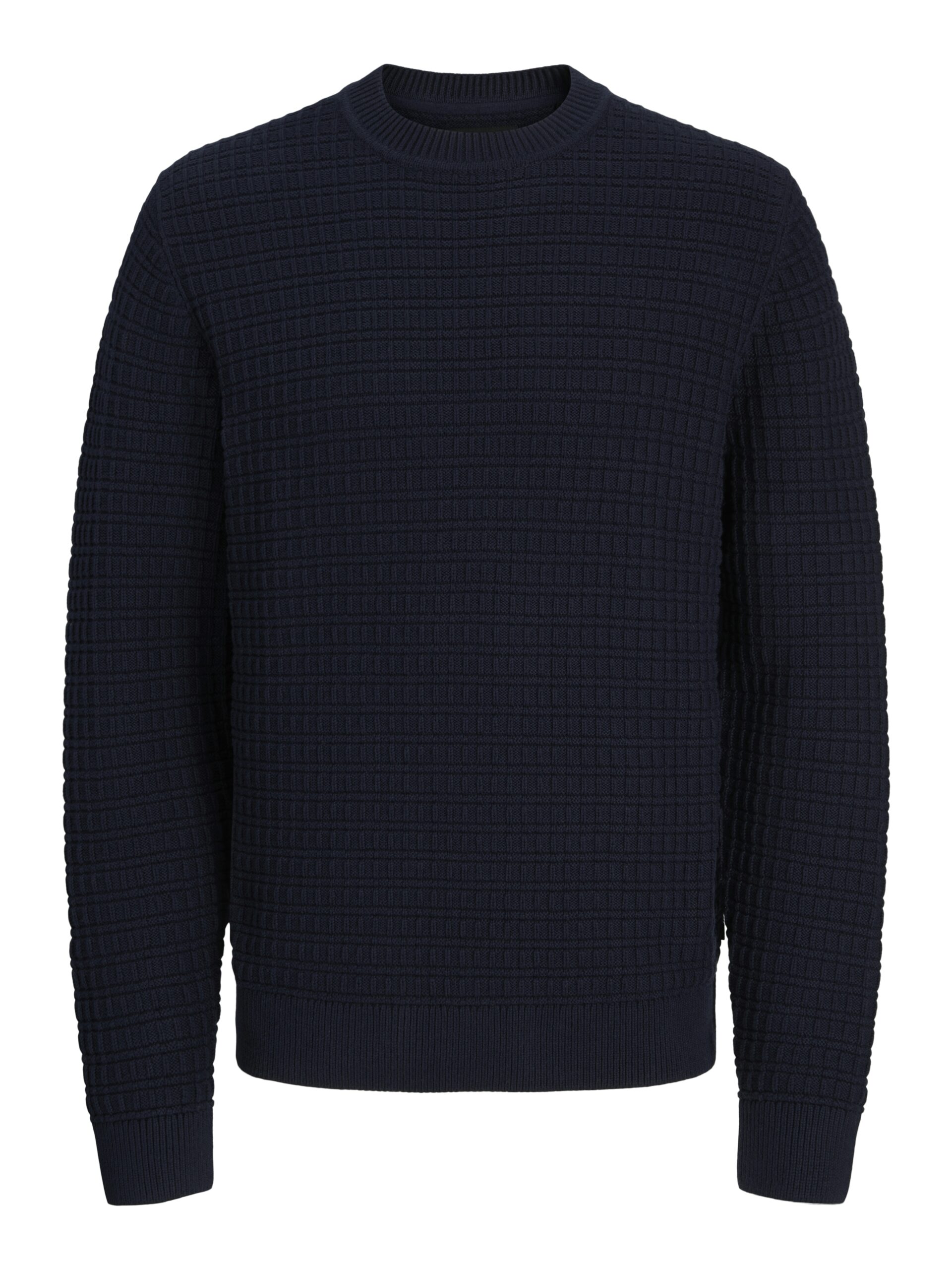 Donkerblauwe gebreide trui met ronde hals met een structuurtje erin.