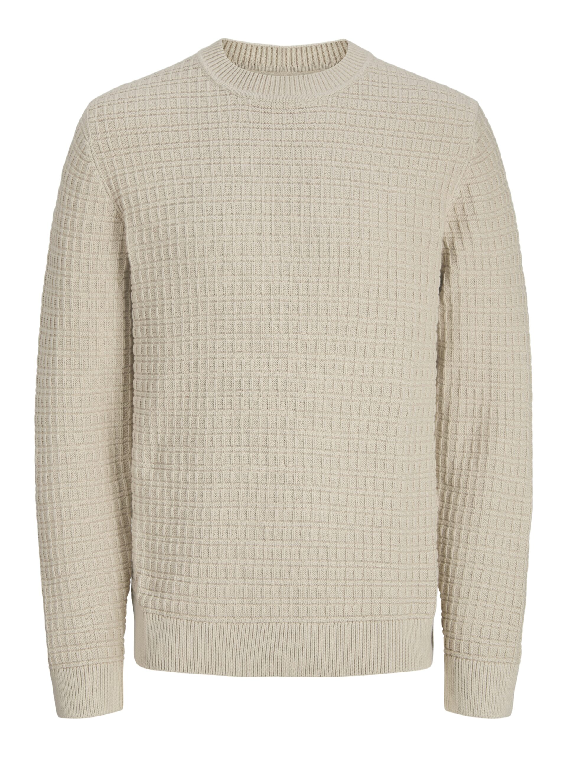 Beige gebreide trui met ronde hals met een structuurtje erin.