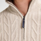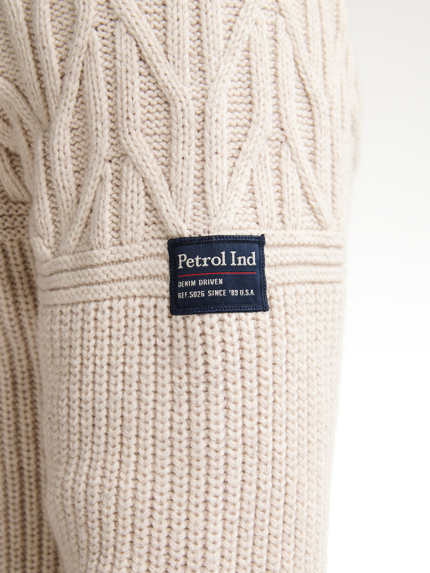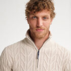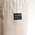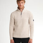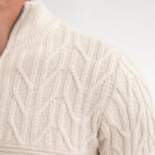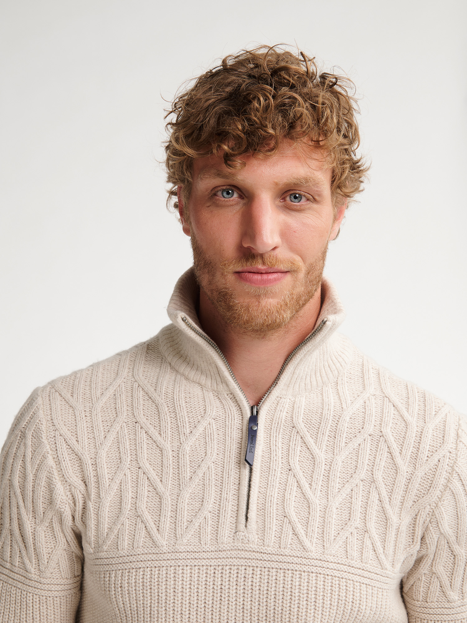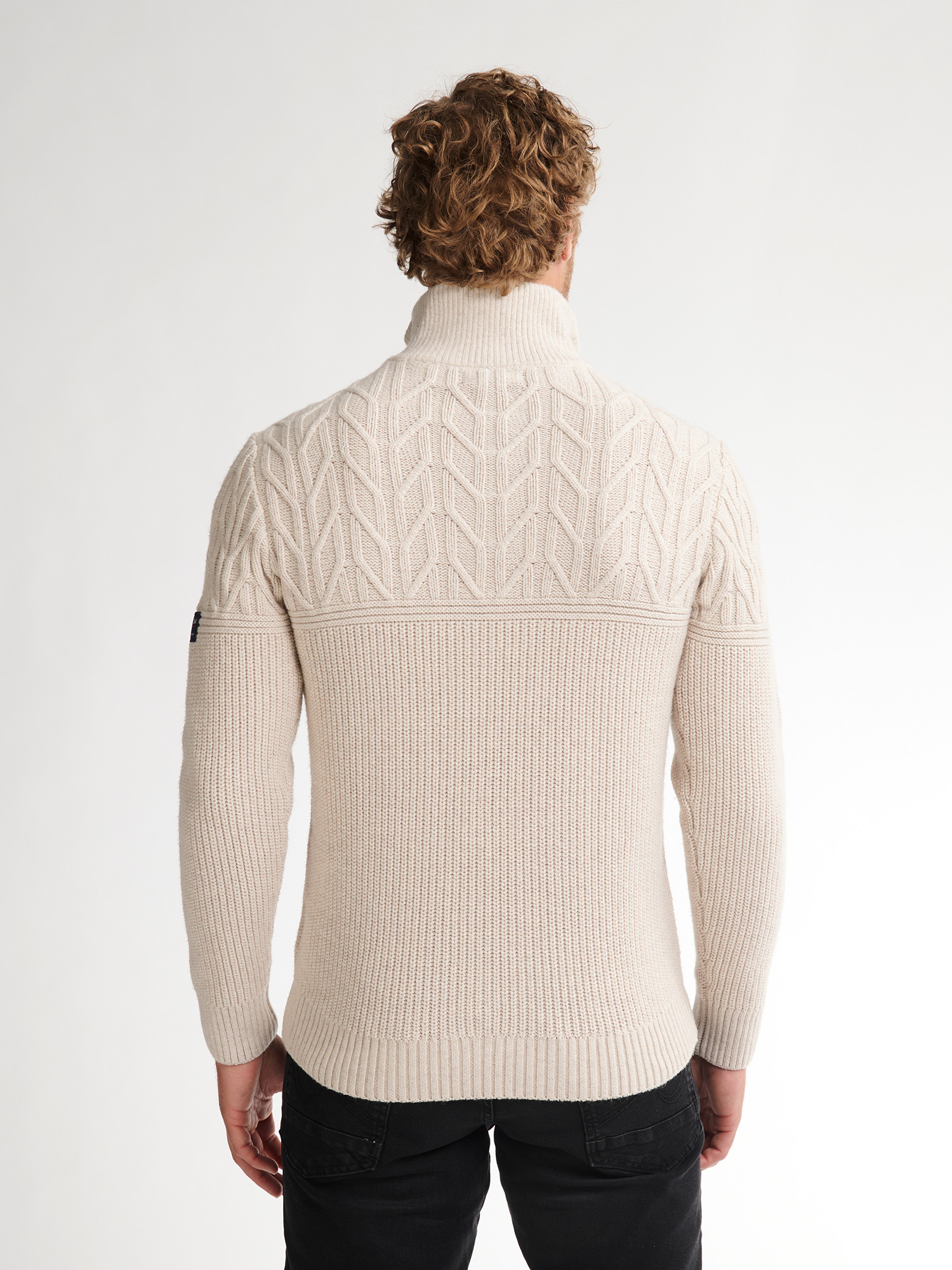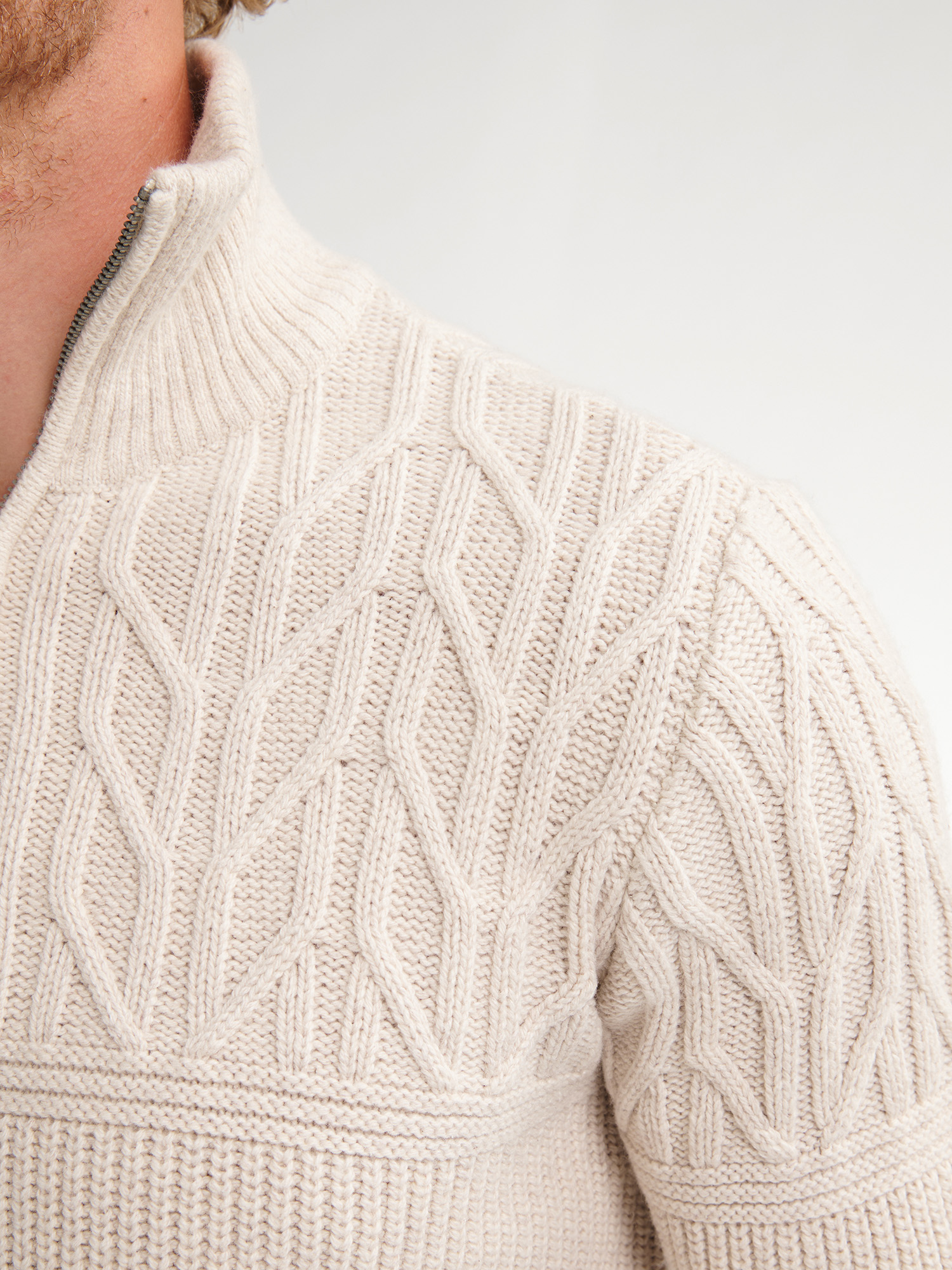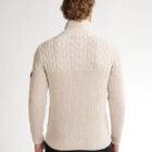 Op de schouderpartij een kabel effect en de rest van het lijf is platbrei.