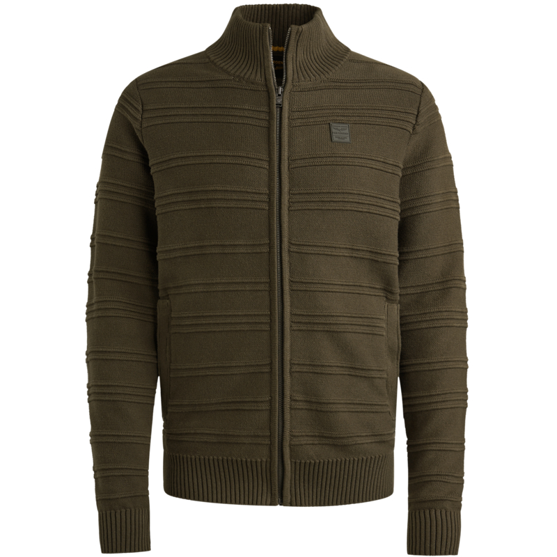 Mooi dik gebreid vest in donkere armygreen. In de stof is een relief print gebreid en het heeft een opstaand boord in de nek.