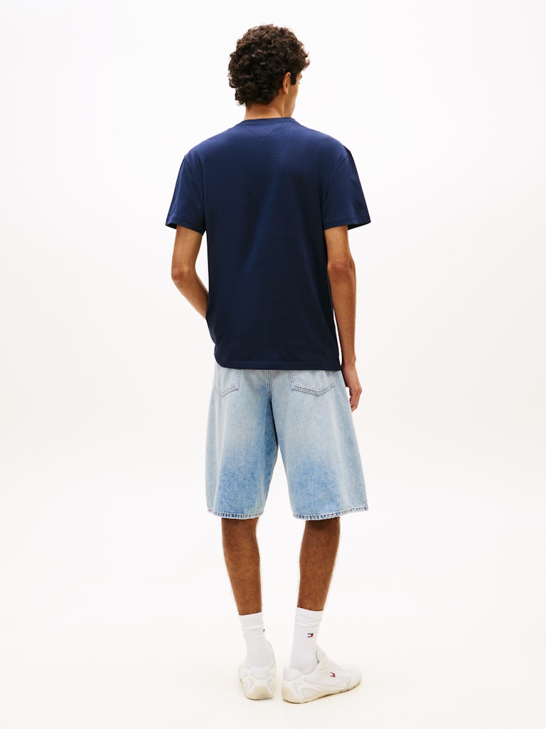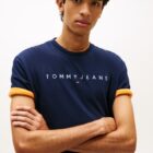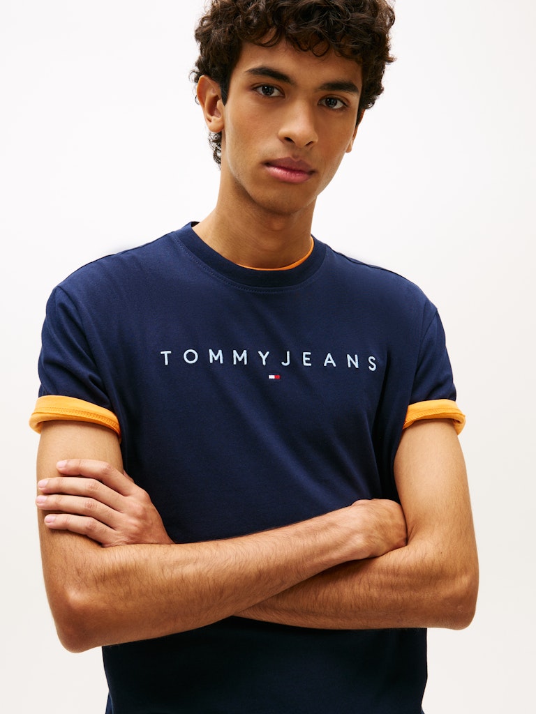 Je kent hem vast al, het linear logo tee van Tommy Jeans. Dit keer in de donkerblauwe uitvoering met babyblauwe ingeborduurde letters.